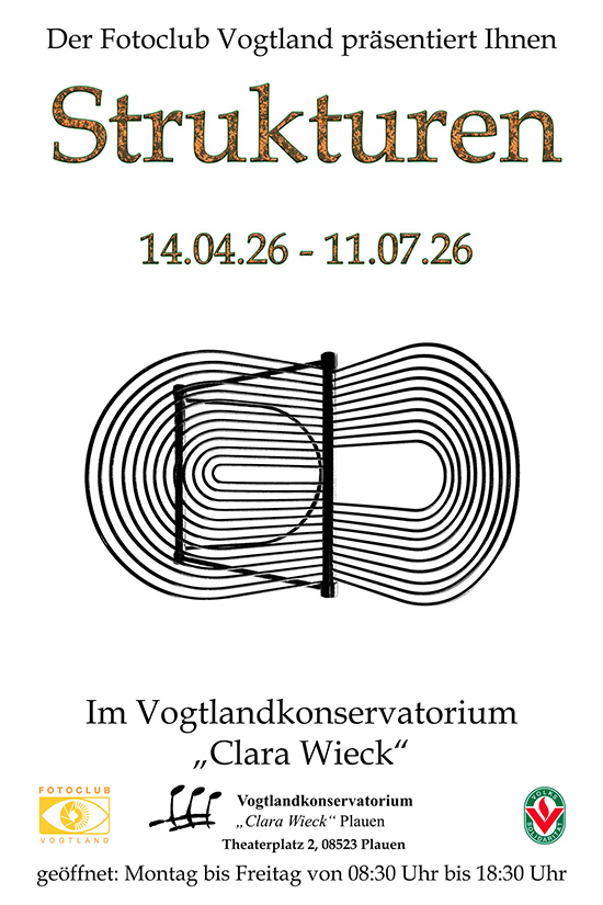 Am 14.04.2026 fand unsere Vernissage zum Jahresthema „Strukturen“ im Vogtlandkonservatorium statt. 21 Clubmitglieder präsentieren 60 Fotos zu diesem Thema. Herr Leitz eröffnete den Abend, dazu gab es 2 Musikstücke, gespielt auf einer Harfe, sehr gelungen. Als solches bezeichnete auch Herr Leitz die Präsentation unserer Aufnahmen. Es ist nun inzwischen die 14. Ausstellung die wir im Konservatorium zeigen dürfen. Vielen Dank an alle anwesenden Clubmitglieder und alle Helfer beim Aufziehen der Bilder und beim Aufbauen der Ausstellung.